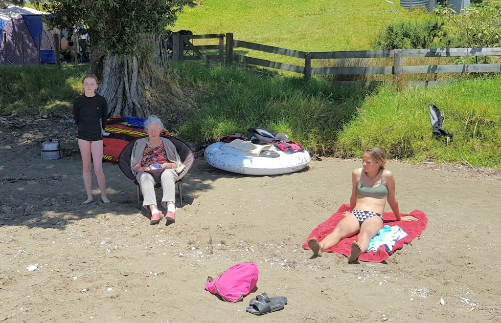 Another regular pastime she had during this period was rowing around the Matakana Estuary at high tide. She still had Mehitabel, an old ten-foot wooden dinghy that was as heavy as lead but would row quite well. These forays always involved a survey of the shoreline for new driftwood that came down the river on the tide, wood that would be gathered up and carried back to her woodshed and used in her kitchen chip-heater. For more significant bits that she couldn’t get into the dinghy, she’d enlist the help of visiting children or grandchildren to recover, and she’d be quite distressed if a subsequent tide took it away before she could get her hands on it.