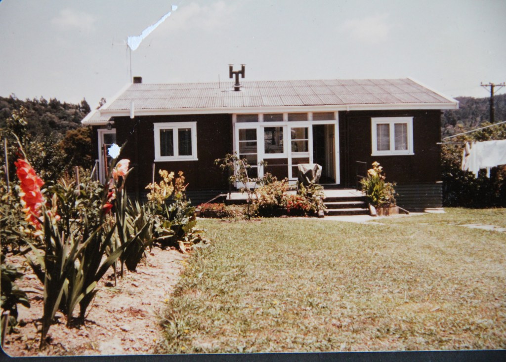 Cecilene was kept on a pile mooring up the Wade River in Silverdale. This involved some travel for Dad as he still had much work to do on her. So, they bought a house in Okura that overlooked the estuary. This was a small and basic fibrolite clad bach, but it was on a magnificent site, and it suited them well. Photos show its transition in the short time they were there, from a bare box on an empty section to a cosy house in a well planted garden. Dad’s sister Gwen later built a house just down the road and when Mum and Dad left for the Pacific, they handed the house over to Nan and Grandpa who were to finally move out of their Exeter Road home.