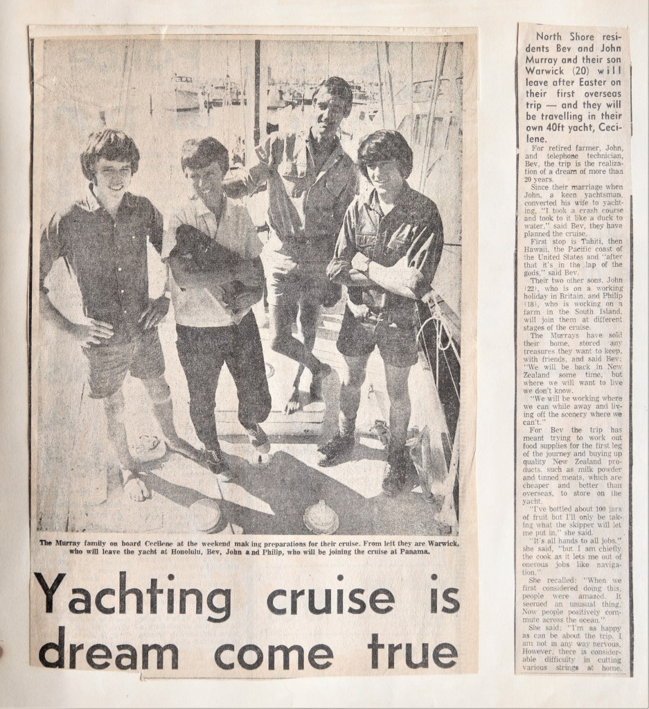 Cecilene, the yacht they had bought while still on Waiheke, was a solid forty-foot Bermudan cutter built from double diagonal Kauri and with a full keel. She had had a good track record in offshore sailing with Philip Houghton, an Otago University medical professor, who sailed her around New Zealand under the name of Murihiku in 1966-67 and wrote a book about it. Dad, who had a good eye for a boat, was convinced of her seaworthiness. Nonetheless, she still needed some work to bring her up to standard for offshore cruising, so he set to work on her while they were still on Waiti. It was another two years before they decided to quit the farm and begin serious plans to go to sea.