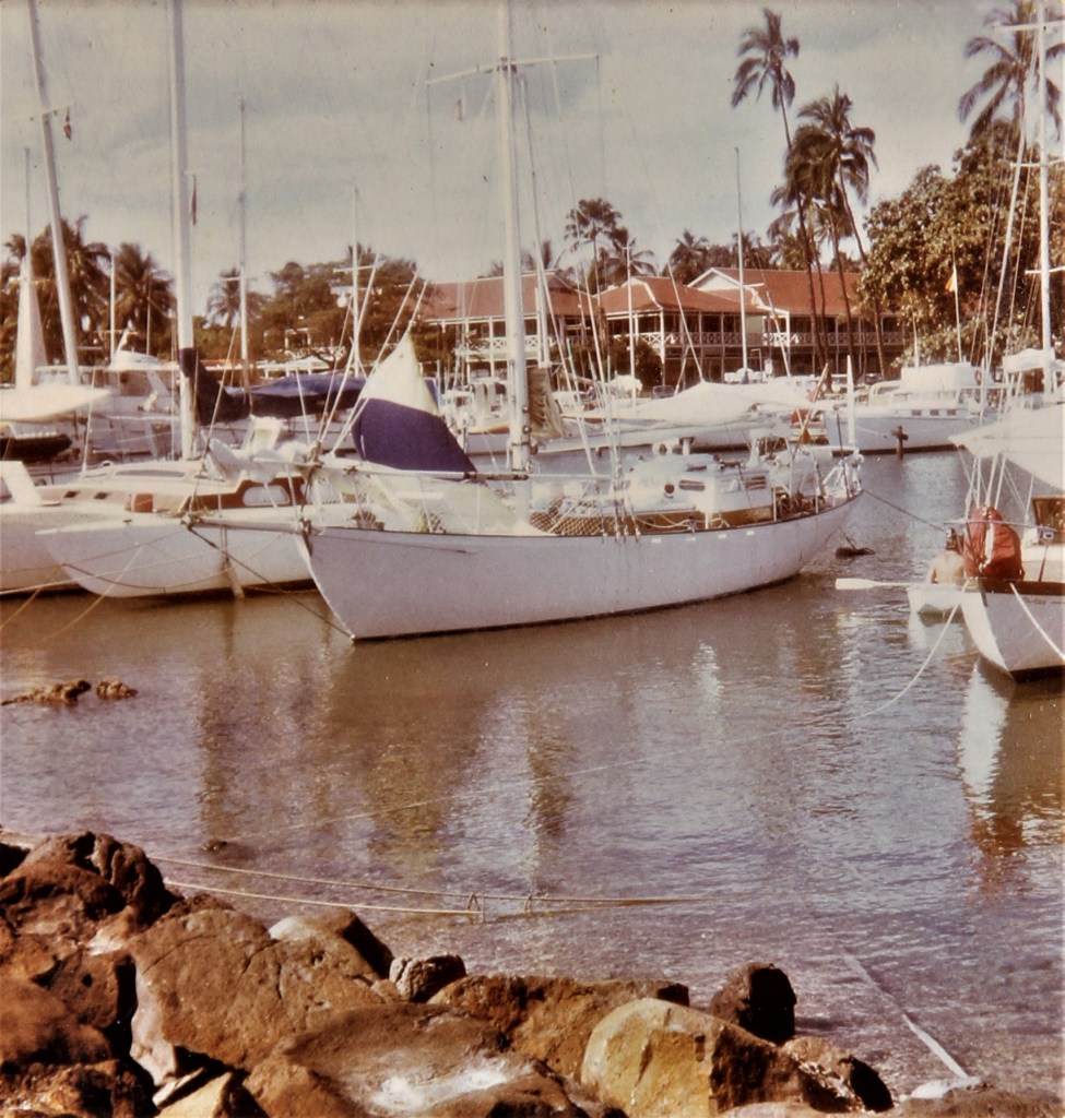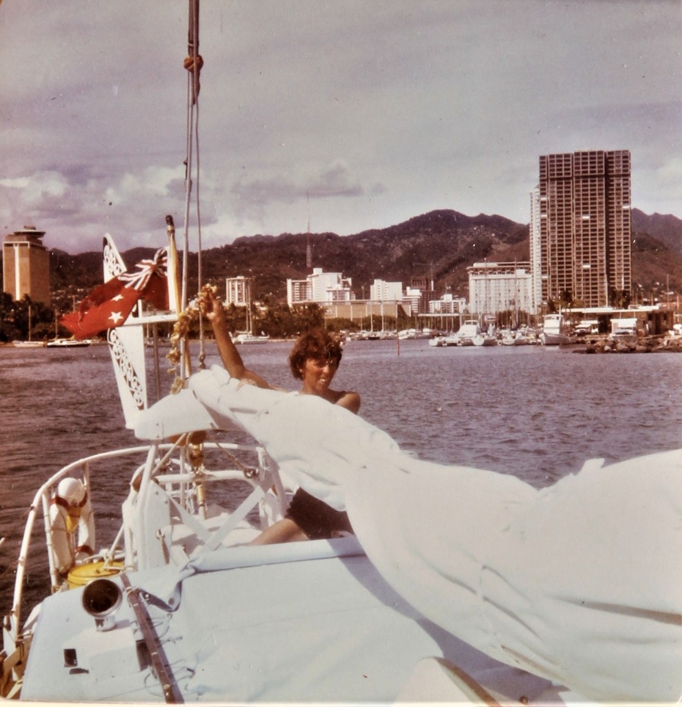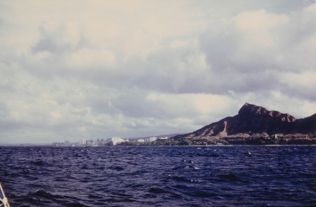 After our stay in Hilo, we island-hopped north to Honolulu. Lahaina on Maui was our favourite. Conversely, Moloka’i was ghastly, as it was just one big Dole pineapple plantation. A dinghy full of pineapples from the barge loading dock in Kaunakakai only slightly softened the bad impression.