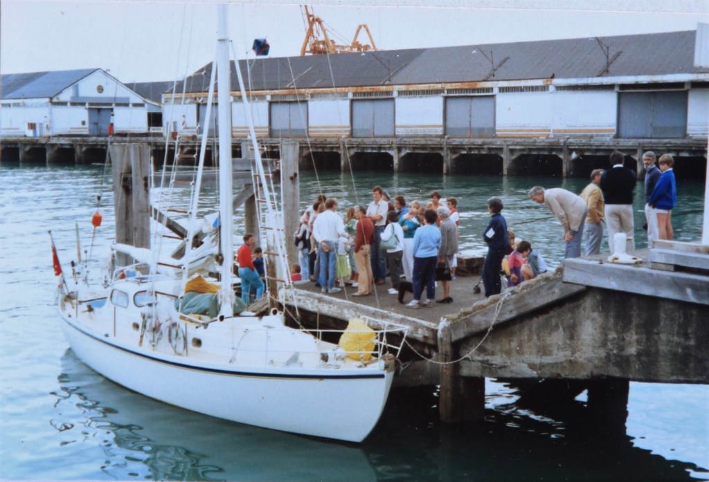 By April 1987, Jane Rhodes was fit to go, they had sold the shop and Mum had quit her job. After endless trips to Sandspit in the old van, Dad had stowed away all they needed for the voyage – but for their French visas. They farmed out the cat – Deuteronomy Boggs – let the house and set off for Auckland where they waited for their visas. It was another two weeks before they finally got away, but on the 9th of May, they slipped their mooring lines from Admiralty Steps and set off down the Waitemata Harbour. Raywin Miller (their daughter-in-law Jude’s sister) had joined them as crew.