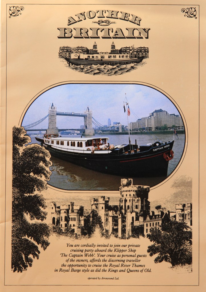 Some days later, after she’d been to visit Ham House with some friends and as they were walking along the canal towpath, she saw a particularly attractive river boat ‘with nice lines’, and on the gangplank, a list of prices for a tour including £500 for the whole boat. Below this, a sign read ‘Crew wanted’. On a whim, she went aboard and two days later, she was signed on as crew. This was the ‘Captain Webb’, a large and elegant barge that had been converted to accommodate and entertain guests. Her duties were to drive the barge, help manage its passage through the locks, do a little maintenance, and assist with the hosting of parties. It was a live-aboard in a comfortable, spacious cabin, and food was provided in the form of sumptuous leftovers.